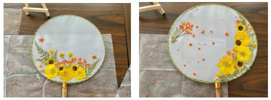 活動(dòng)伊始,工作人員向大家介紹了傳統團扇的文化背景和干花團扇的制作步驟及要領(lǐng)。大家根據材料包配的干花,用自己靈巧的雙手,在素白的扇面上,認真選材,細細構圖、大膽設計、精心粘制,一邊擺弄一邊交流,忙得不亦樂(lè )乎,同時(shí)發(fā)揮自己的想象力,沒(méi)多久,一把把造型優(yōu)美的團扇相繼出爐,不僅能夠納涼消暑,還很與眾不同。